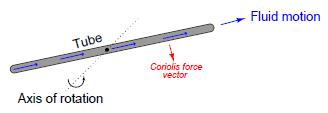 If we replace the ball with a fluid moving through a tube, and we introduce a rotation vector by tilting that tube around a stationary axis (a fulcrum), a Coriolis force develops on the tube in such a way as to oppose the direction of rotation just like the Coriolis force opposed the direction of rotation of the rotating platform in the previous illustration: