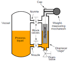 The displacer itself is usually a sealed metal tube, weighted sufficiently so it cannot float in the process liquid. It hangs within a pipe called a “cage” which is connected to the process vessel through two block valves and nozzles. These two pipe connections ensure the liquid level inside the cage matches the liquid level inside the process vessel, much like a sight glass.
