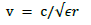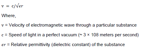 Electromagnetic waves travel at the speed of light, 2.9979 × 108 meters per second in a perfect vacuum. The velocity of an electromagnetic wave through space depends on the dielectric permittivity (symbolized by the Greek letter “epsilon,” ǫ) of that space. A formula relating wave velocity to relative permittivity (the ratio of a substance’s permittivity to that of a perfect vacuum, symbolized as ǫr and sometimes called the dielectric constant of the substance) and the speed of light in a perfect vacuum (c) is shown here: