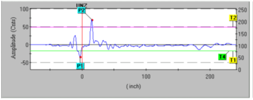 This next screen capture shows the same level transmitter measuring a water level that is 8 inches higher than before. Note how pulse P2 is further to the left (indicating an echo received sooner in time), indicating a lesser ullage (greater level) measurement: