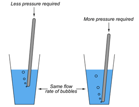 The deeper you submerge the straw, the harder it becomes to blow bubbles out the end with your breath. The hydrostatic pressure of the water at the straw’s tip becomes translated into air pressure in your mouth as you blow since the air pressure must just exceed the water’s pressure to escape out the end of the straw. So long as the flow rate of air is modest (no more than a few bubbles per second), the air pressure will be very nearly equal to the water pressure, allowing measurement of water pressure (and therefore water depth) at any point along the length of the air tube.