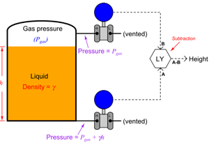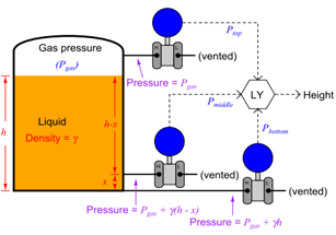 Once the computer knows the value of γ, it may calculate the height of liquid in the tank with great accuracy based on the pressure measurements taken by the bottom and top transmitters: