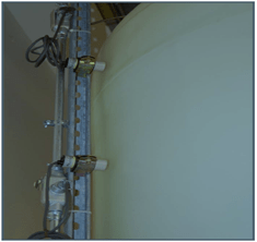 Another electronic liquid level switch technology is a capacitive type, sensing level by changes in electrical capacitance between the switch and the liquid. The below photograph shows a couple of capacitive switches sensing the presence of water in a plastic storage vessel: