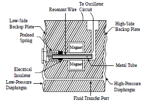 In the resonant wire pressure transducer, an oscillator circuit causes a wire to oscillate at its resonant frequency, while the wire tension is varied as a function of the process pressure. The resonant wire design is used to detect differential pressures. The process pressures are detected by the high-pressure and low-pressure diaphragms on the right and left of the unit. As the pressure difference rises, the fill fluid transmits a corresponding force to the wire, excited by the magnetic field. Backup plates support the diaphragms to prevent overpressure damage. The change in the wire tension modifies the resonant frequency of the wire, which is then digitally counted.