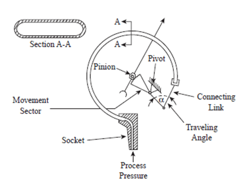 In this, the process pressure is connected to the tube support end of the tube, while the tip end is sealed. Because of the difference between inside and outside radii, the Bourdon tube presents different areas to pressure, which causes the tube to tend to straighten when pressure is applied.