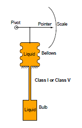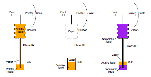Class I and Class V systems use a liquid fill fluid (class V is mercury). Here, the volumetric expansion of the liquid drives an indicating mechanism to show temperature: