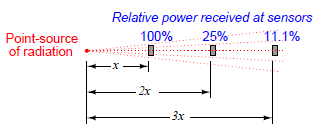 Placing a sensor at three integer distances (x, 2x, and 3x) from a radiation point-source results in relative power levels of 100%, 25% (one-quarter), and 11.1% (one-ninth) falling upon the sensor at those locations, respectively: