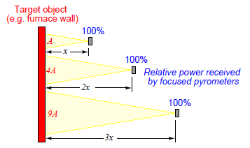 So, even though the inverse square law correctly declares that radiation emanating from the hot wall (which may be thought of as a collection of point sources) decreases in intensity with the square of the distance, this attenuation is perfectly balanced by an increased viewing area of the pyrometer. Doubling the separation distance does result in the flux from any given point on the wall spreading out by a factor of four, but the pyrometer now sees four times as many similar points on the wall as it did previously. So long as all the points within the field of view are uniform in temperature, the result is a perfect cancellation with the pyrometer providing the exact same temperature measurement at any distance from the target.