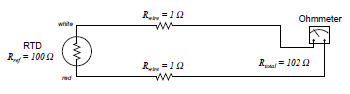 The following schematic diagrams show the relative effects of 2 ohms of total wire resistance on a thermistor circuit and on an RTD circuit: