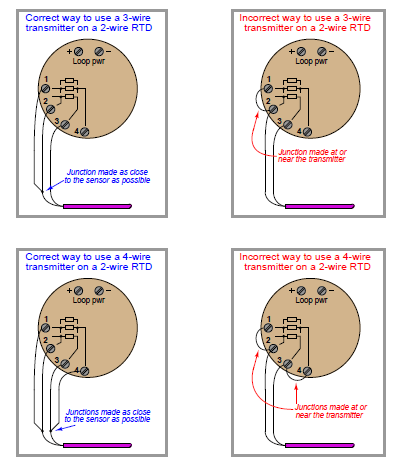 The above illustrations show both correct and incorrect ways to connect a 2-wire RTD to a 3- or 4-wire transmitter. Jumpers placed at the transmitter terminals defeat the purpose of the transmitter’s 3-wire or 4-wire capabilities, downgrading the performance to that of a 2-wire system.