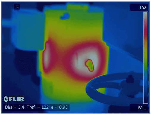 This electric motor is in a vertical orientation, with the electrical connection box in the upper-left corner and two prominent hot spots on both the near and the left-facing sides of the case. A manual valve handle appears in the foreground, silhouetted in dark blue against a lighter blue (warmer) background. A lifting “eye” on the motor case appears as a green (cooler) shape in the middle of a white (warmer) area. The two “hot spots” correspond directly to stator windings and iron pole faces inside the motor.