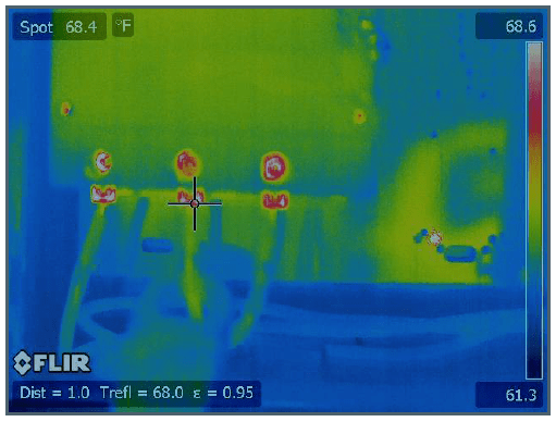 The hottest objects in this image are the three load screw terminals, appearing as white/red against a blue/green background. Note the range of the temperature scale on the right of the image: this image only spans a temperature range of 61.3 degrees F to 68.6 degrees F. This narrow temperature range tells us the differences in temperature shown by the colors in this image are nothing to worry about.