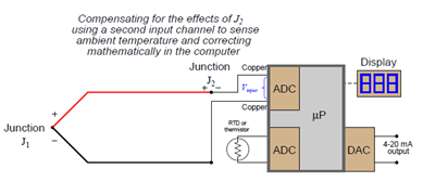 Since we know the calculated value of Vrjc should be equal to the real reference junction voltage (VJ2), the result of this digital addition should be a compensated total equal only to the measurement junction voltage VJ1: